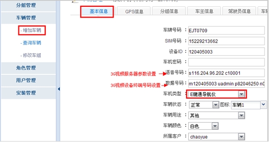 打开后台监控管理—增加车辆—基本信息,填写语音号码、数据号码、车机类型选择“E键通导航仪”,如图1 所示