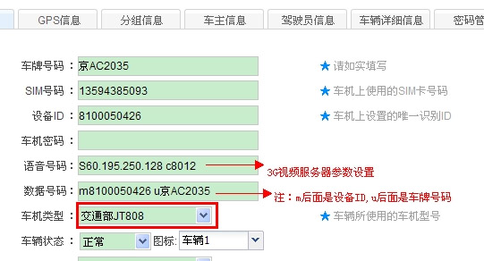 打开后台监控管理—增加车辆—基本信息,填写语音号码、数据号码、车机类型选择“交通部JT808”,(如图2)