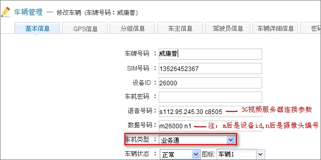 打开后台监控管理—增加车辆—基本信息,填写语音号码、数据号码、车机类型选择“业务通”,如下图所示