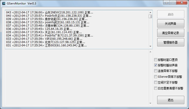 为了方便用户随时监控服务器的运行情况,我们开发了GPS服务器监控工具,主要分为网站异常、gserver服务器异常、磁盘空间不足异常、数据库空间不足异常、数据库日志需要清理等异常。可以通过报警时播放声音,来提醒用户尽快处理。