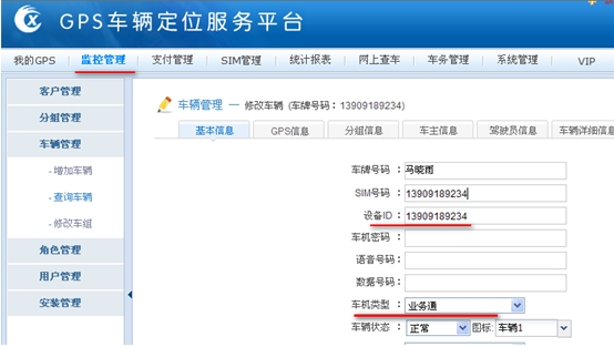 1.在车辆定位服务平台的后台管理增加车辆页面,设备id和手机上填写的设备编号保持一致。车机类型选择“业务通”,点击保存。如下图: