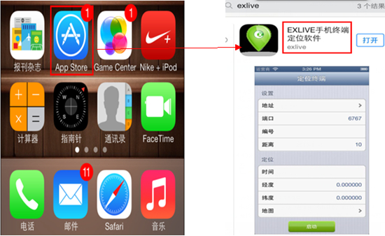 1.点击App Store进入苹果应用商店: 在商店中搜索exlive 选择 EXLIVE手机终端定位软件exlive下载并安装,如下图(1) >> 点击下载“iPhone版手机终端定位“