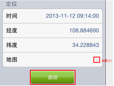 4.定位栏:点击启动按钮之后,时间,经度,纬度自动出现当前手机当前的位置的经纬度,如图(6)