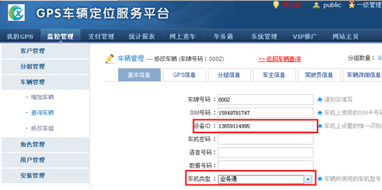 1.在车辆定位服务平台的后台管理增加车辆页面,设备id和手机上填写的设备编号保持一致。车机类型选择“业务通”,点击保存。如下图: