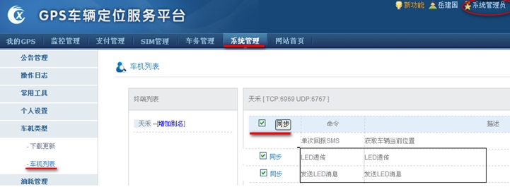 1.Exlive技术更新服务器gserver之后,客户用最高权限的管理员账号(即系统管理员)登录后台管理,在"系统管理 —> 车机类型 —> 车机列表"中将天禾的"LED透传""发送LED消息"两个命令同步。如下图1