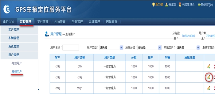 3.进入"监控管理 —> 用户管理 —> 查询用户",对管理员账号点击"修改"按钮,如下图3,对一级管理员chkj进行修改。
