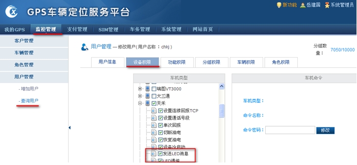 4.在修改页面,设备权限中,将天禾刚才同步的两条命令"LED透传""发送LED消息",打勾选中,点击保存。如下图4,这就完成了给管理员chkj下发此命令权限。