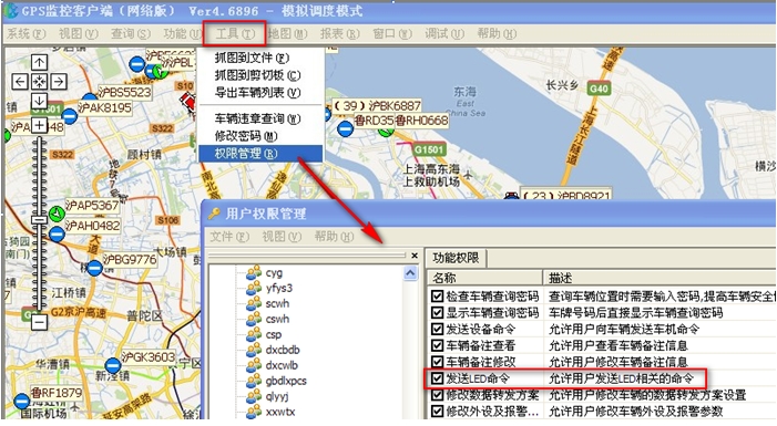 6.后台管理下发权限完成后,用管理员账号chkj登录客户端,在"工具 —> 权限管理"中,给普通监控员将"发送LED命令"打勾选中。保存。