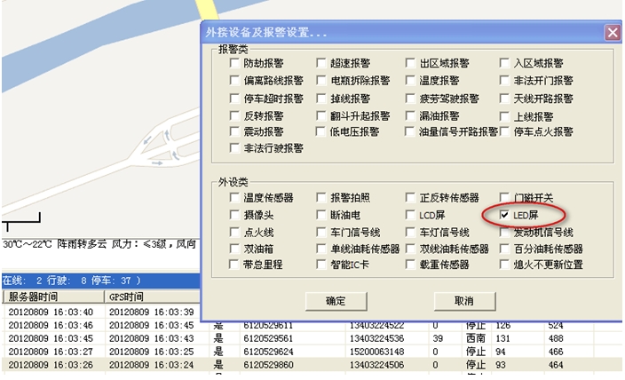7.客户端下方车辆窗车辆上点击右键,外设设备及报警设置中,给"led屏"打勾选中,如下图