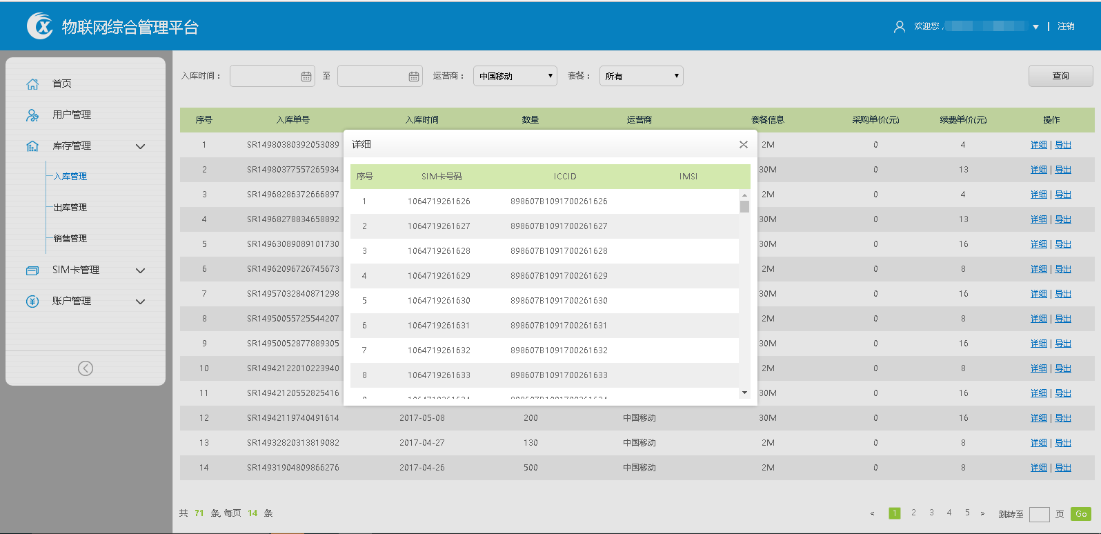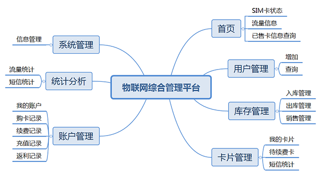 物联网综合管理平台(http://sim.exlive.cn)基于中国移动运营商,面向全国范围的物联网用户,提供采用物联网专用号段的物联网卡的查询,批量发送短信,短信记录查询,流量查询,批量续费等相关业务功能。由首页、用户管理、库存管理、SIM卡管理、账户管理五个模块构成。