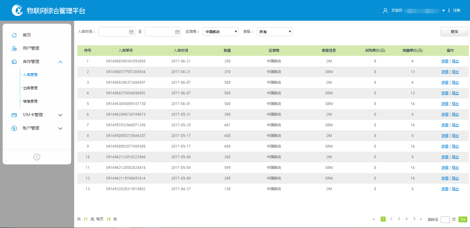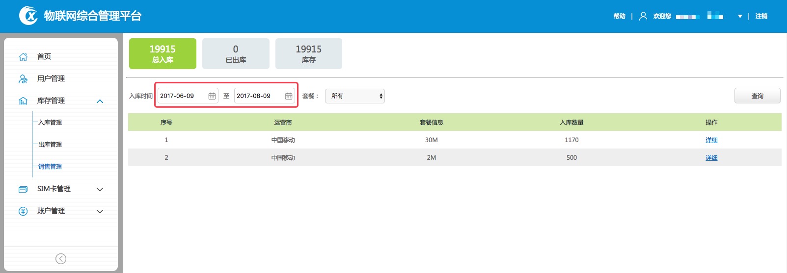 显示购买的每一批次卡片订单信息:购买时间、金额、套餐等也可自定义时间查找某个时间段内的入库信息(图3)