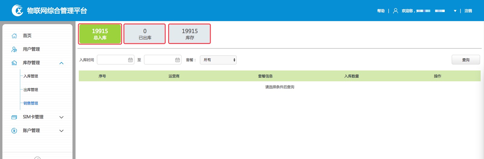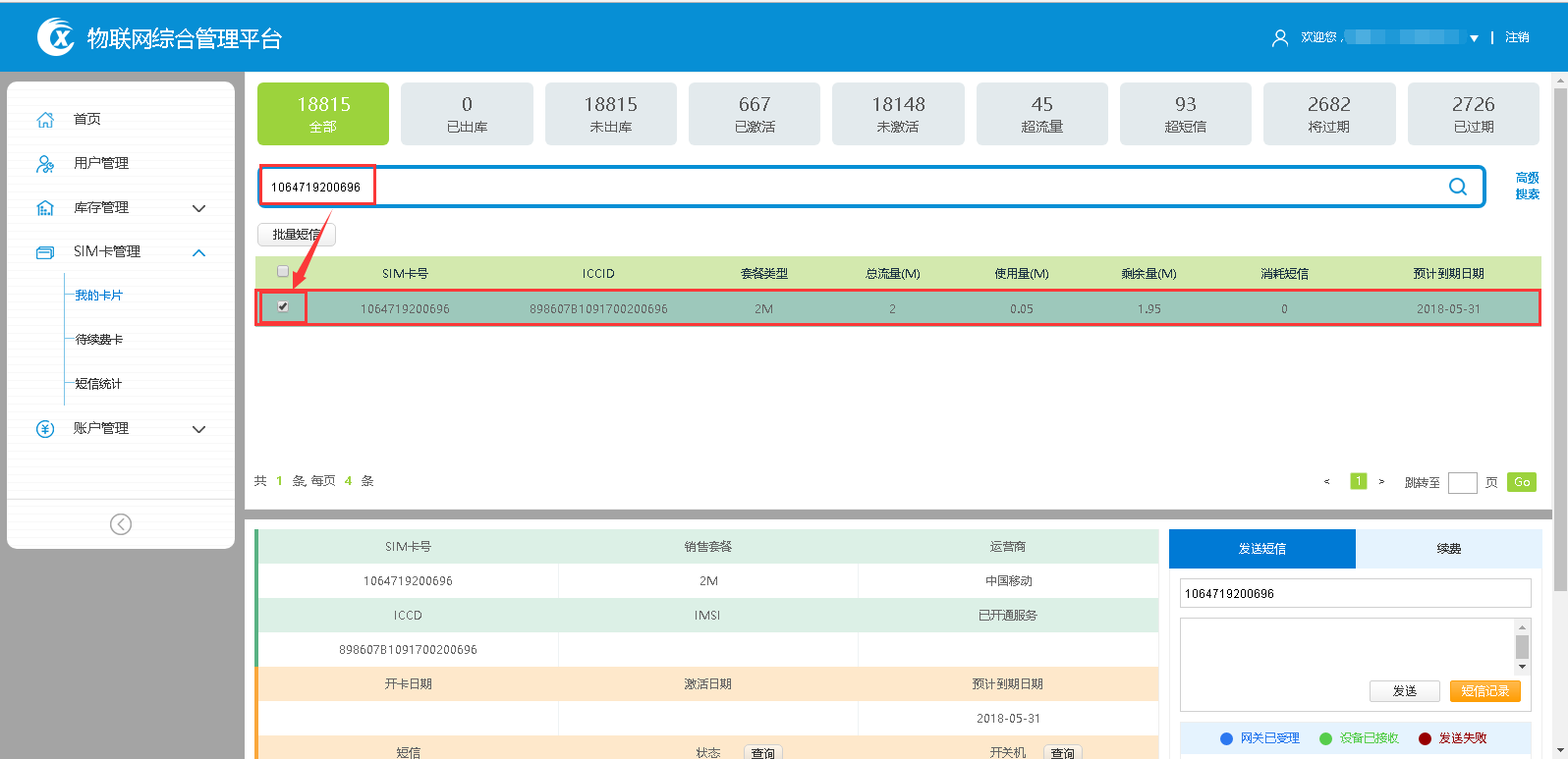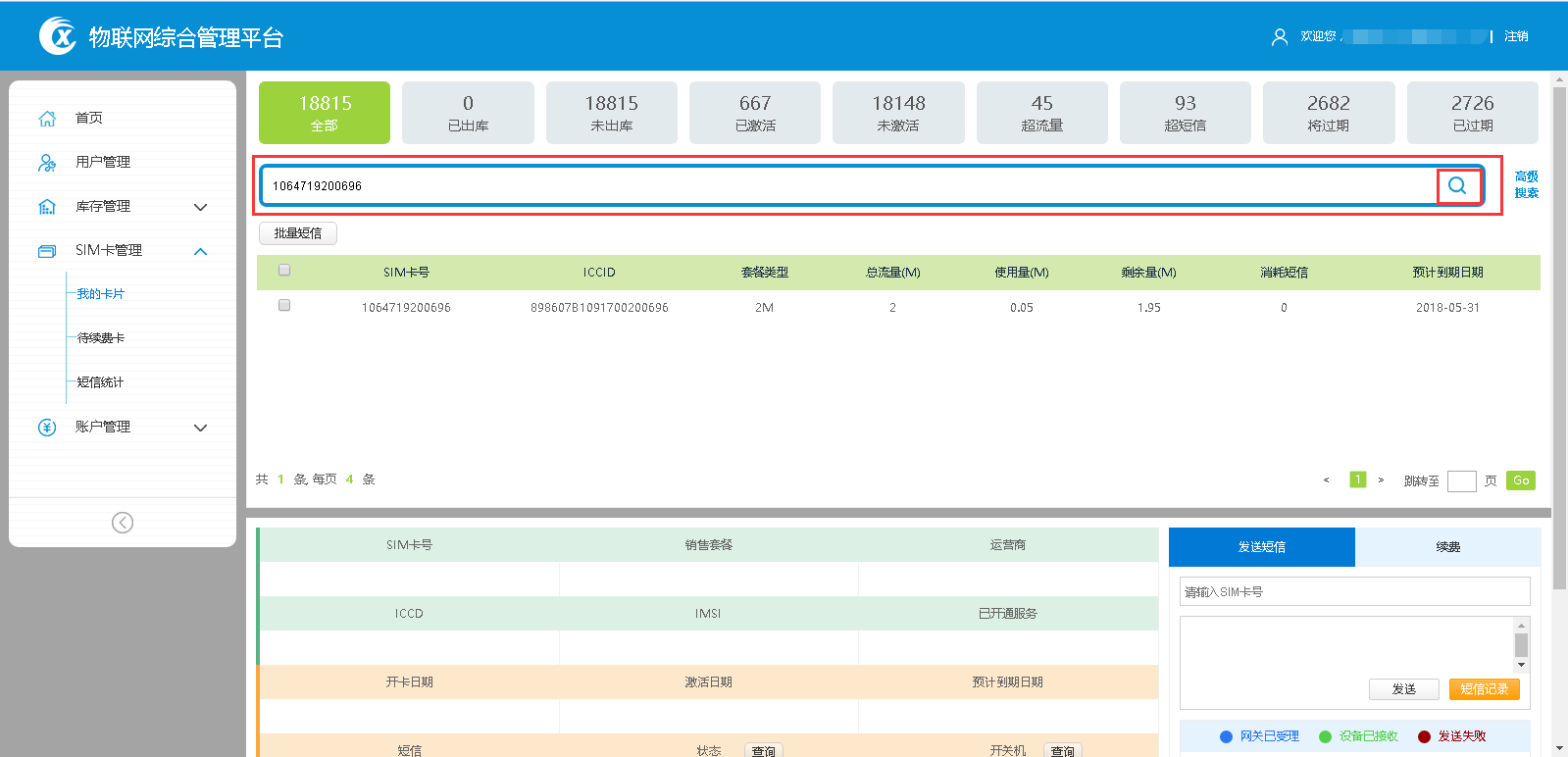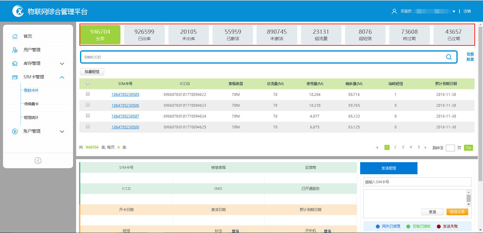 1. SIM卡库存状态:显示总入库数,出库,库存数量,便于用户及时了解库存状况,保持卡源充足。