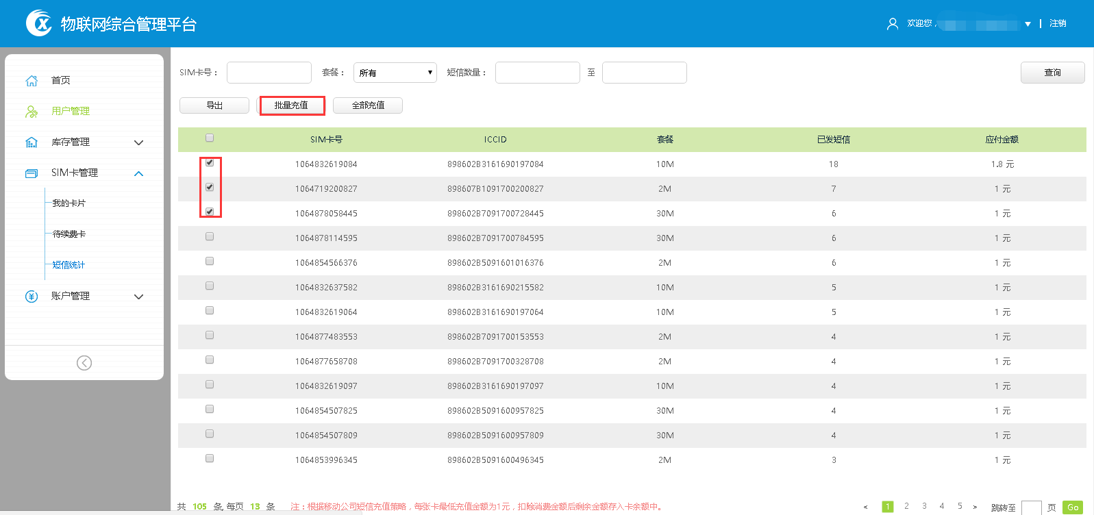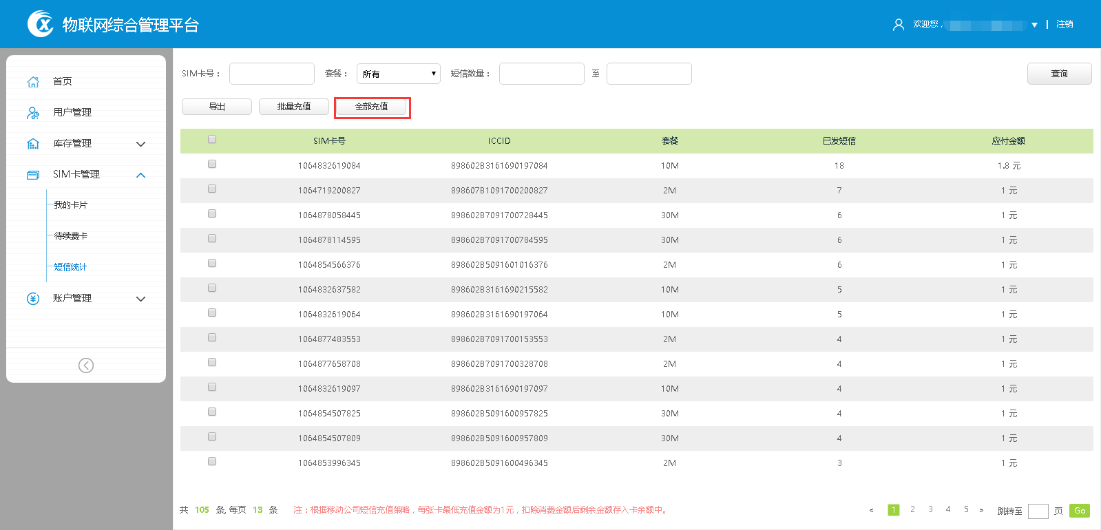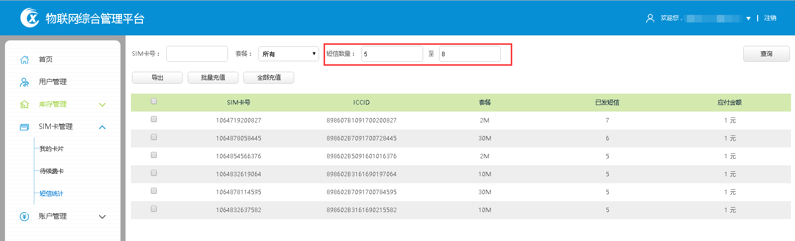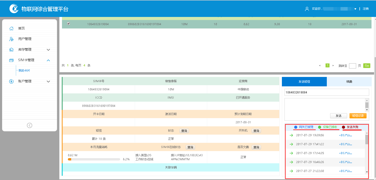 1. SIM卡库存状态:显示总入库数,出库,库存数量,便于用户及时了解库存状况,保持卡源充足。