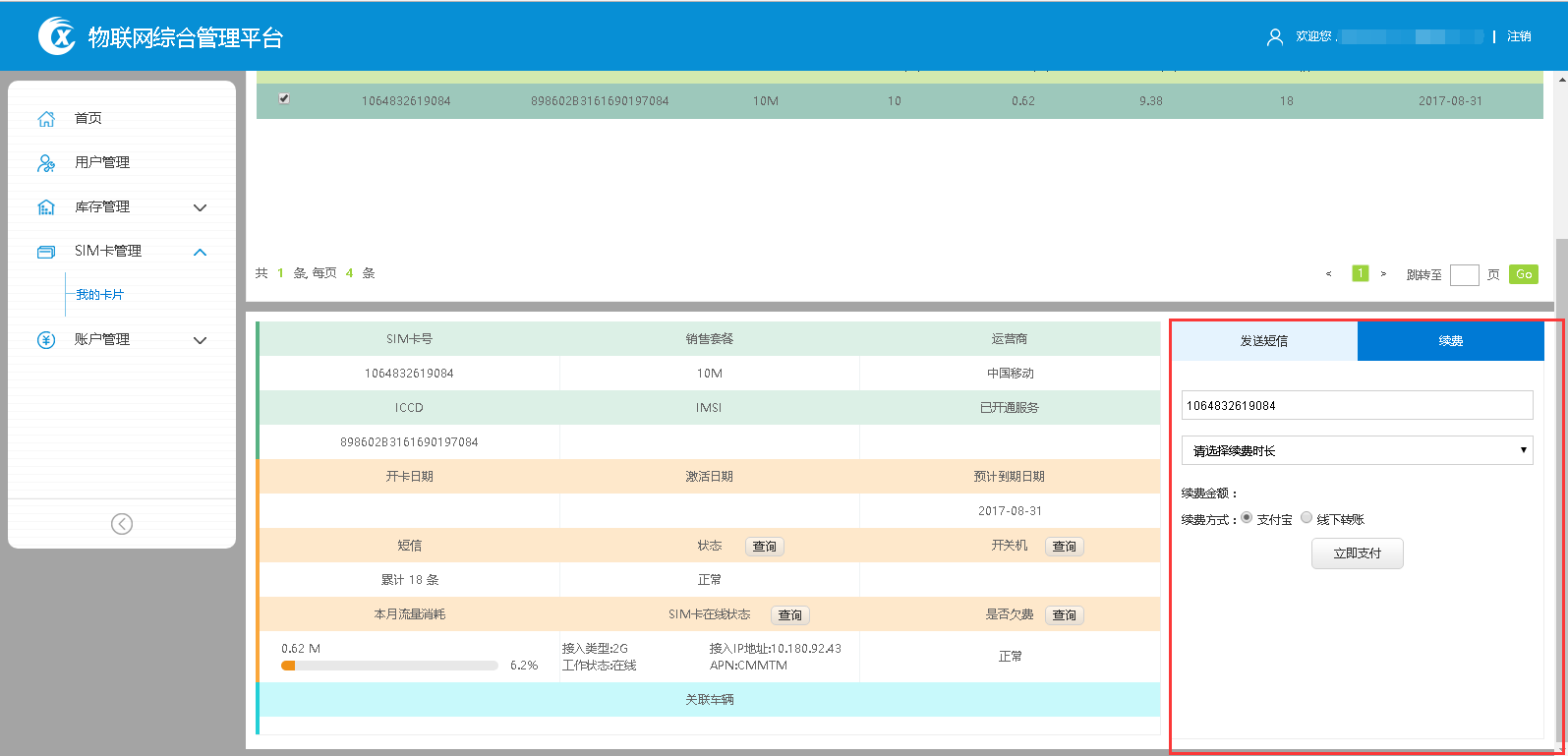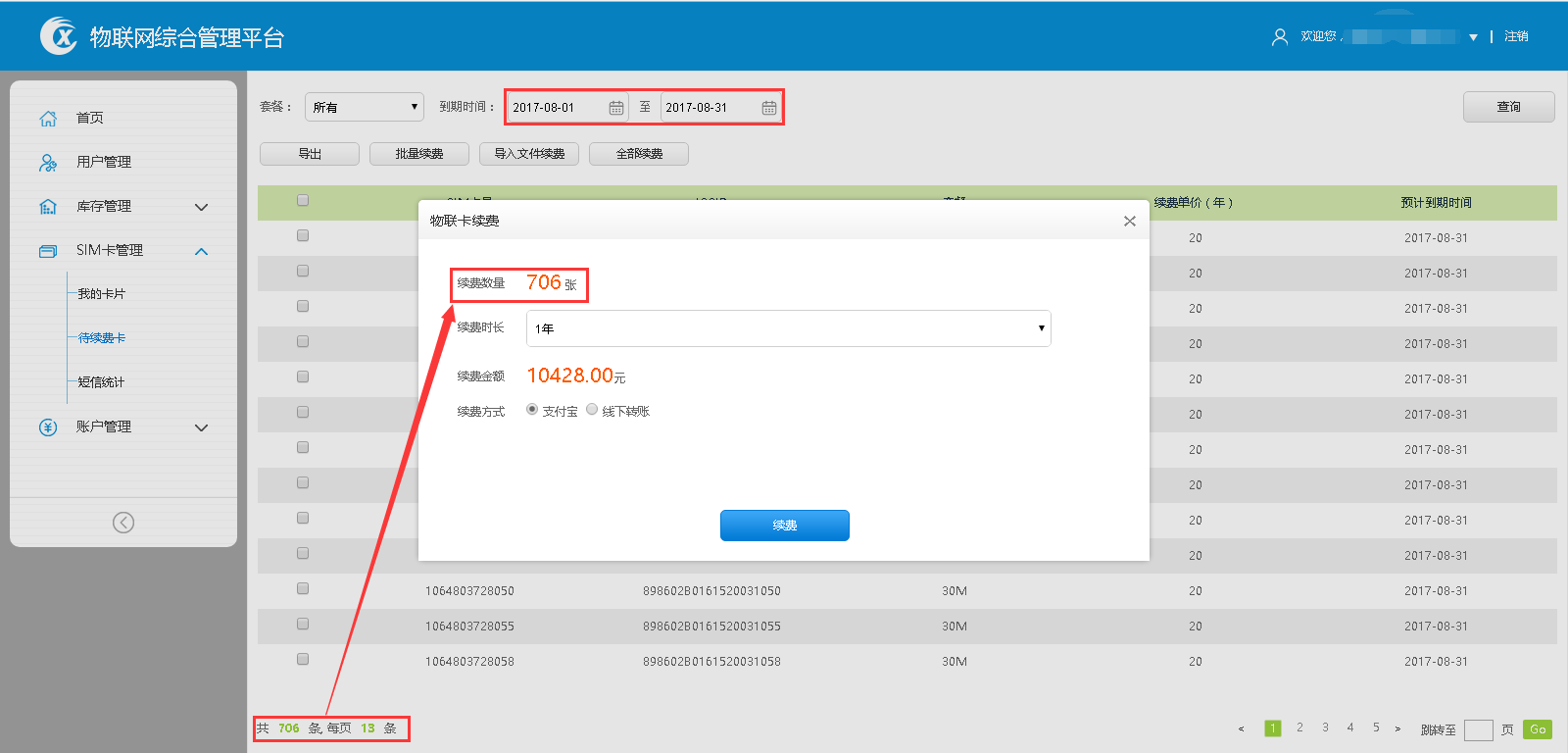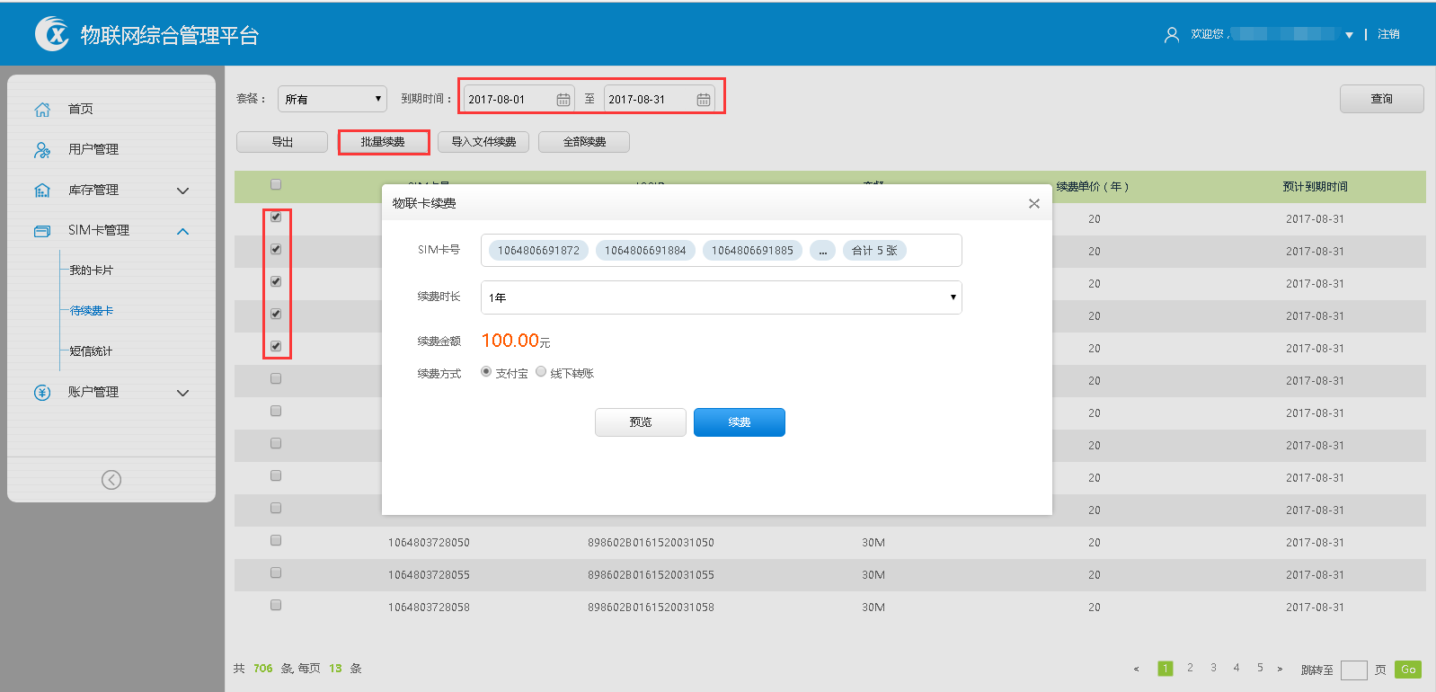 批量续费可按照套餐,按照到期时间进行查询,勾选需续费的卡,再点击批量续费,系统自动计算续费金额,用户可选择线上(支付宝)或线下续费