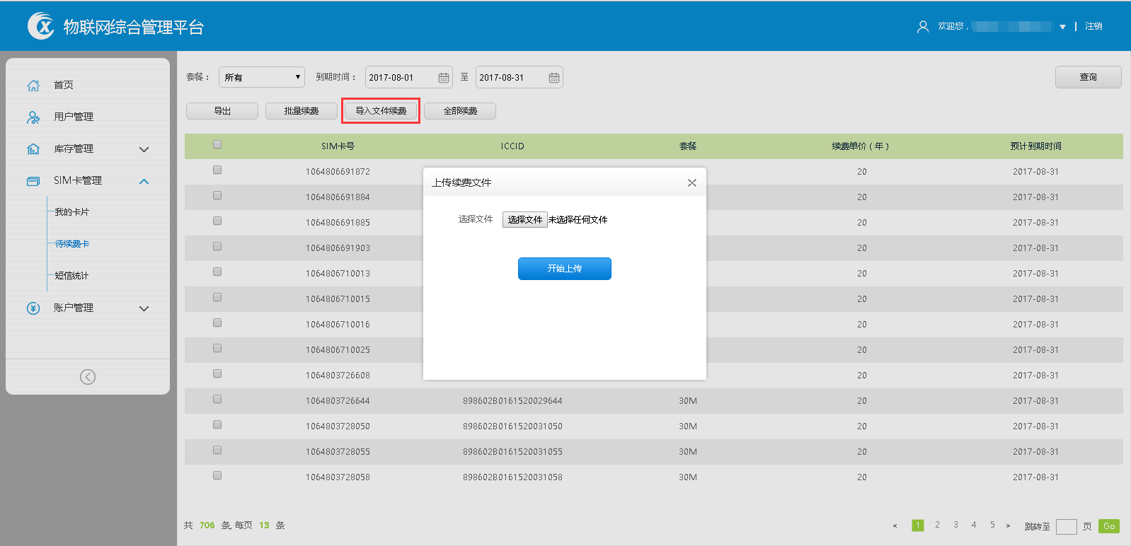 3、导入续费文件(格式参照模版),上传成功后按“全部续费”步骤操作进行续费(图18)