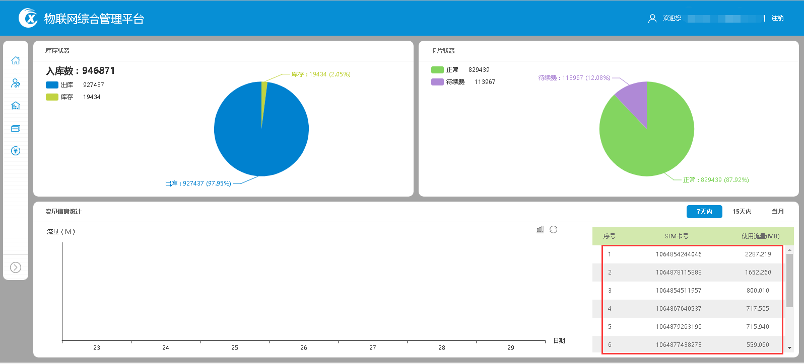 用以展示相关统计信息,可显示SIM卡库存状态,已售卡片状态,和流量信息统计。