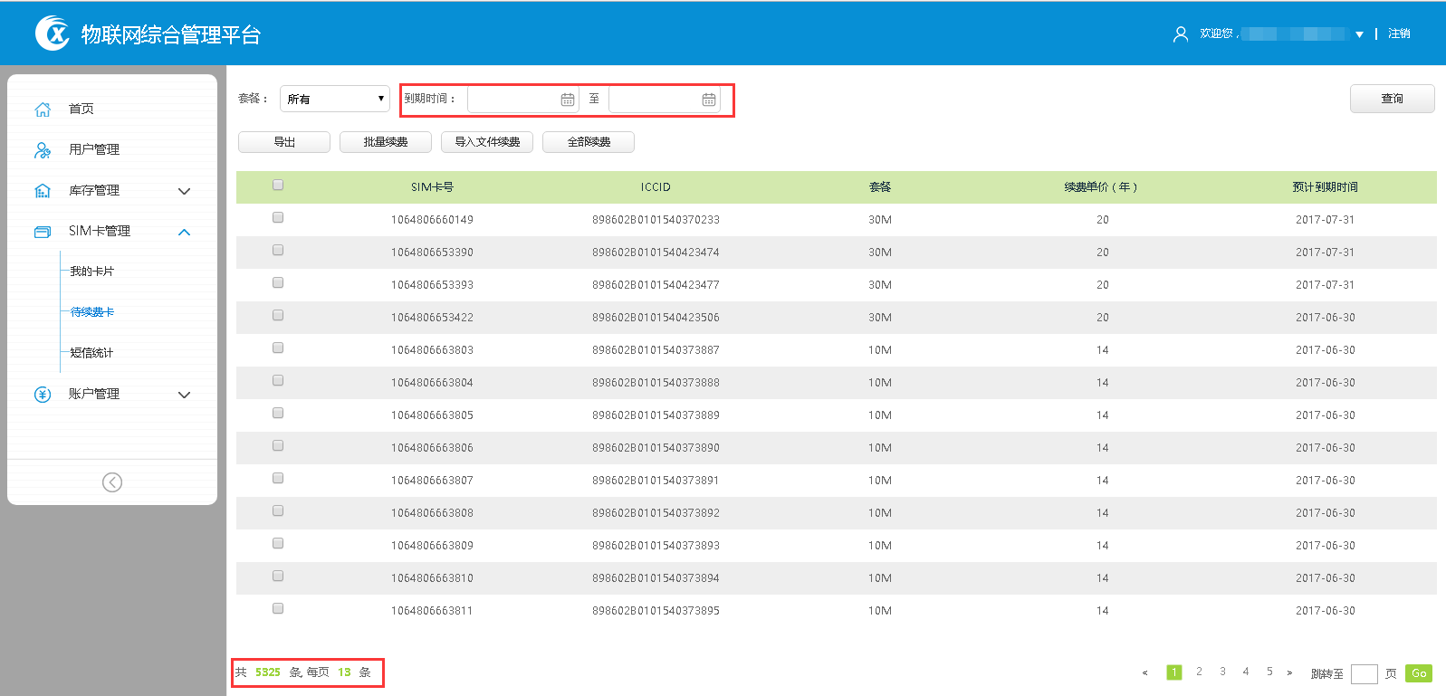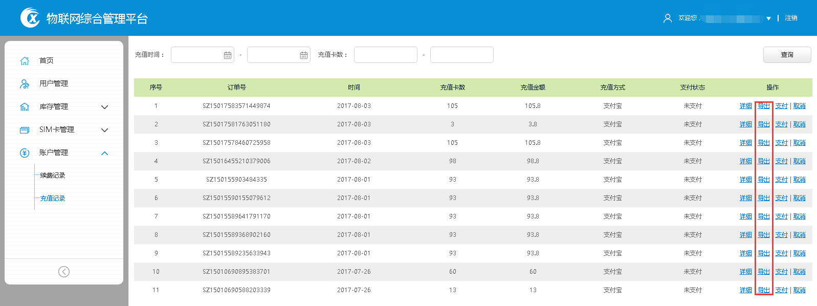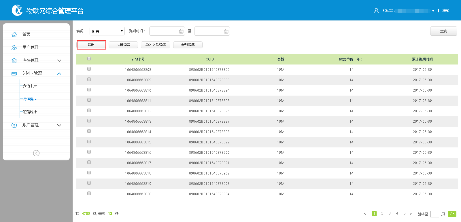 默认导出可续费期的所有卡号,也可以导出某个时间段的卡号(图19)