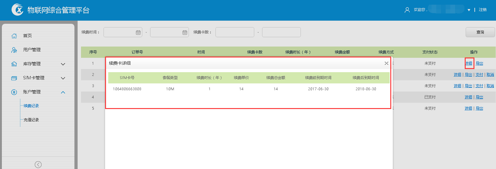 续费记录:显示历史续费的所有订单信息,点击详细按钮,罗列续费卡详细: 续费卡号、套餐、续费单价、续费后到期时间(图25)