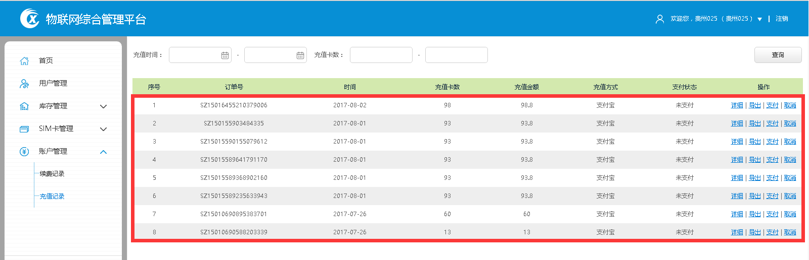 充值记录:显示历史充值的所有订单信息:订单号、充值时间、充值卡数量、充值金额、充值方式、充值状态(图26)