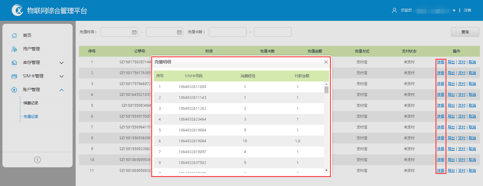 点击订单后面的详细按钮显示您此次入库所有卡号的详细信息(图4)