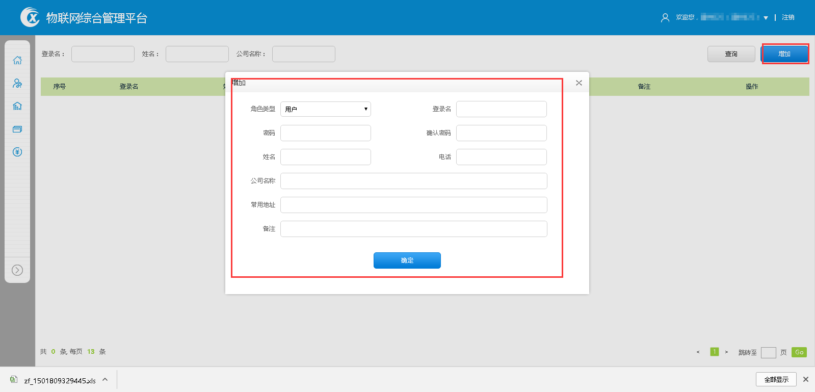 用户管理主要用来创建下级客户帐号,用以登陆物联网综合管理平台。
