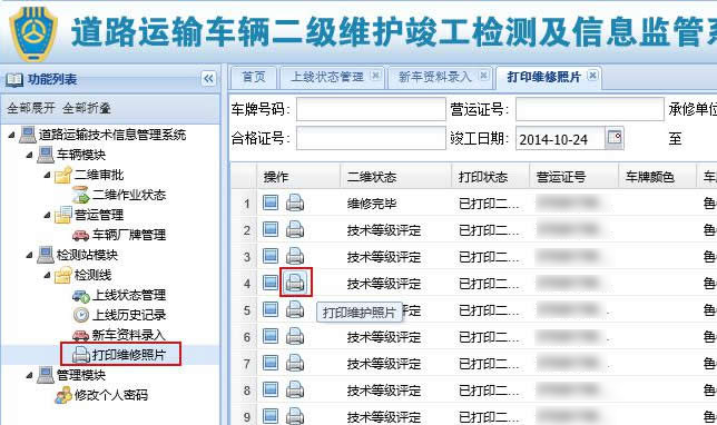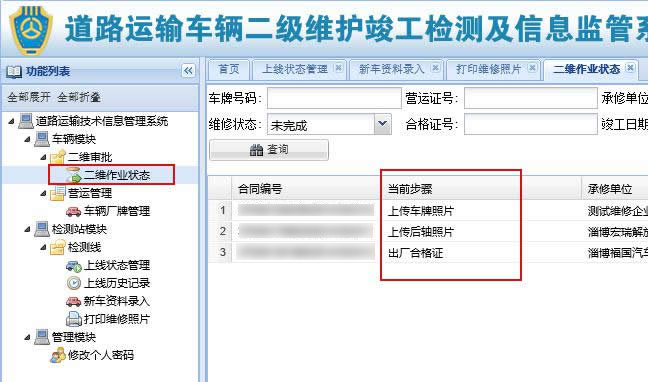 以此需要进行的步骤为:作业前检测记录的信息录入及打印 --> 上传第二张照片,上传第三张照片,上传第四张照片 --> 作业过程信息的录入和打印 --> 维修用料明细表的录入和打印 --> 结算清单录入及打印,竣工合格证的录入和打印,外检单的录入和打印 ,至此车辆维修企业二维作业完毕。