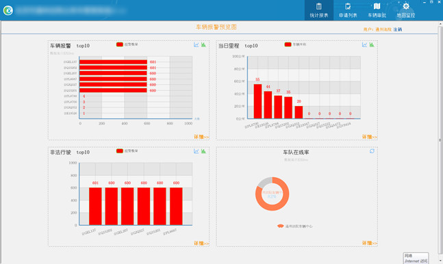 >> 行驶报表:行驶报表(行驶报表,里程报表,位置报表,超速报表);报警统计(全部报警,超速报警,非法行驶报警)等