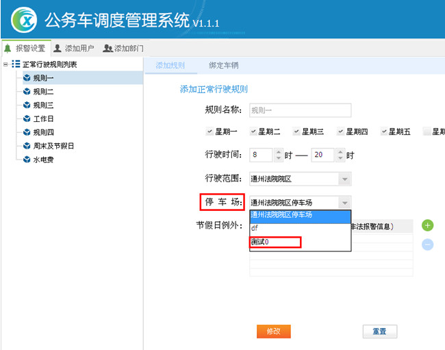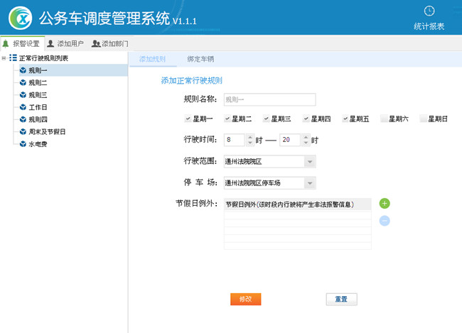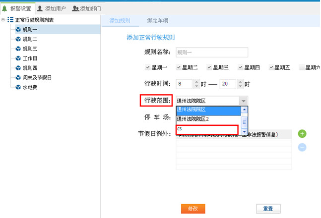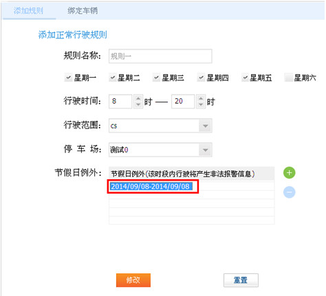 填写规则名称 —> 选择每周上班周期 —> 选择每天行驶时间 —> 选择行驶范围(地图监控创建的围栏)—>选择停车场(地图监控创建的标注)—> 添加节假日时间,这个时间正好在行驶周期之内—> 点击添加,规则一创建成功。如图15