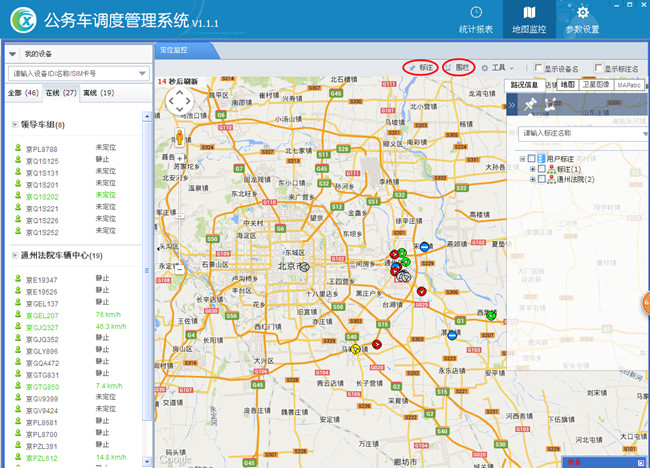 在公务车主要使用电子围栏和标注,在公务车调度系统中标注适用于车辆停车地点,电子围栏适用于车辆的行驶区域。如图6