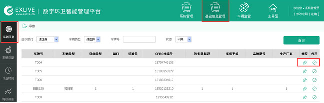 1.车辆信息(环卫系统自动读取位置服务后台所录入的车辆信息,这里在环卫系统里添加环卫车机类型”等信息),根据实际运营修改/停用车辆,如图6