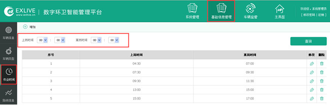 基础信息管理包括:车辆信息、车辆类型、作业时间、路线信息、停车场,作业模块几个功能模块。