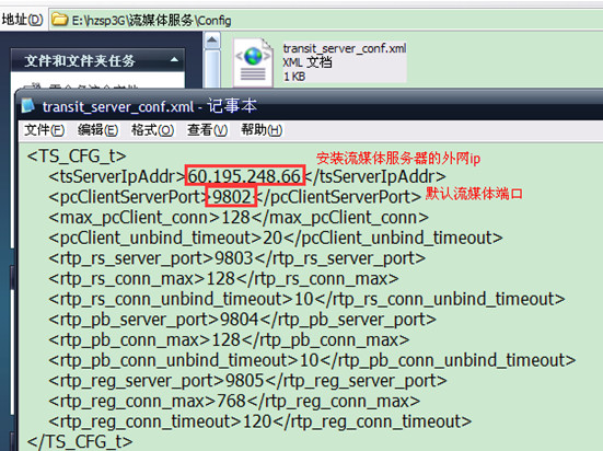 2.安装完打开进行设置,设置参数如下图,找到安装流媒体服务的根目录下Config文件下 transit_server_conf.xml,进行ip的配置。9805是设备连接平台的端口,9802是请求视频端口,9803,9804录像回放及下载端口。