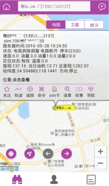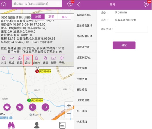 可实时监控设备,由当前位置、关注设备、历史轨迹、追踪、命令、sim卡、违章、街景、导航组成。