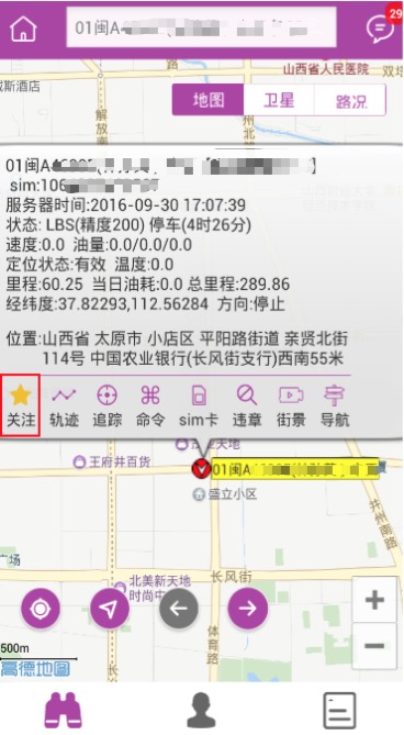1.2)关注设备: 是车辆特别标注功能,是将认为需要特别关注的车辆,加上关注,以后要查看这些车辆时,可在地图上快速查看所有关注的车辆。