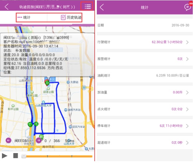 1.3.2点击详细按钮,可以很直观的查看回放轨迹的行驶时间、报警次数、加油量、油耗、点火时长、停车时长及超速次数统计